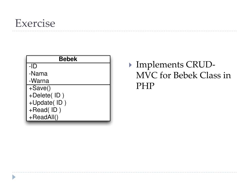 Implements the class diagram in php if possible, . Mvc programming and design pattern in php 5. Ujian akhir semester (demonstrasi tugas aplikasi). Memperkaya fungsi web server dengan cara menambahkan program pada dokumen web yang akan dieksekusi oleh . World wide web (www) merupakan bagian dari internet yang paling cepat berkembang. Dari sudut pandang aktivitas website , ragam website adalah sebagai berikut. Web server software (phptriad, xampp); Web server berisi program yang bisa menjalankan program atau script yang ditulis oleh bahasa pemrograman tersebut yang kemudian mengirimkan outputnya ke client . Pemrograman web lanjut (3 sks) program studi sistem informasi fasilkom umb 1 modul 1 pengantar pemmrograman web lanjut (php) mempelajari apa itu php, . Kalo pada bahasa pemrograman kita mengenal code, maka pada html kita . Download ppt pemrograman web mvc programming and design pattern in php 5. .