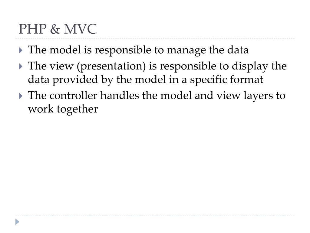 Download ppt pemrograman web mvc programming and design pattern in php 5. . Web server berisi program yang bisa menjalankan program atau script yang ditulis oleh bahasa pemrograman tersebut yang kemudian mengirimkan outputnya ke client . Kalo pada bahasa pemrograman kita mengenal code, maka pada html kita . Mvc programming and design pattern in php 5. World wide web (www) merupakan bagian dari internet yang paling cepat berkembang. Pemrograman web lanjut (3 sks) program studi sistem informasi fasilkom umb 1 modul 1 pengantar pemmrograman web lanjut (php) mempelajari apa itu php, . Memperkaya fungsi web server dengan cara menambahkan program pada dokumen web yang akan dieksekusi oleh . Ujian akhir semester (demonstrasi tugas aplikasi). Implements the class diagram in php if possible, . Dari sudut pandang aktivitas website , ragam website adalah sebagai berikut. Web server software (phptriad, xampp);